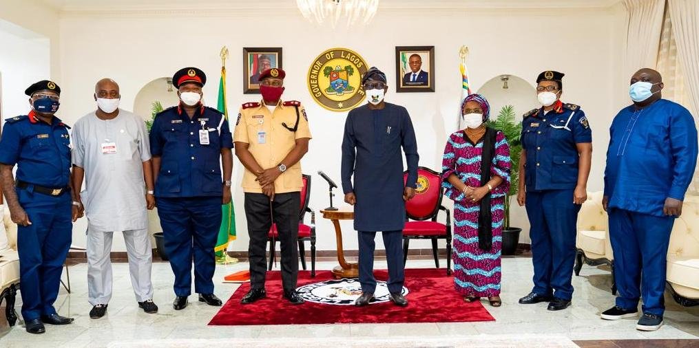 L-R: Assistant Commandant, Nigeria Security and Civil Defence Corps (NSCDC), Mr. Akinsola Aderemi; Chief Security Officer to the Governor, Mr. Adeleke Smith; NSCDC State Commandant, Mr. Adeyinka Fasiu Ayinla; Sector Commander, Federal Road Safety Corps (FRSC) in charge of Lagos, Mr. Olusegun Ogungbemide; Lagos State Governor, Mr. Babajide Sanwo-Olu; Secretary to the State Government, Mrs. Folasade Jaji; NSCDC Deputy Commandant in Lagos, Maria Ihuoma and Special Senior Assistant on Security to the Governor, Mr. Bayo Ogunlana, during a courtesy call on the Governor by the Commandants, at Lagos House, Marina, on Thursday, July 23, 2020.